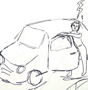 In the car, I’m able to figure out which key is the one but not able to find the thing. I stab again and again at the steering wheel shaft, but the goddam ignition is nowhere. It’s AWOL. I feel with my fingertips for about ten hours because it’s too dark to see and my eyes won’t focus anyway. Finally I get it and the engine starts. Yes! I’m such a rebel! No pleasure but meanness – I just don’t friggin’ care. I might die. That’s fine. I’m so fucking tired of everything.